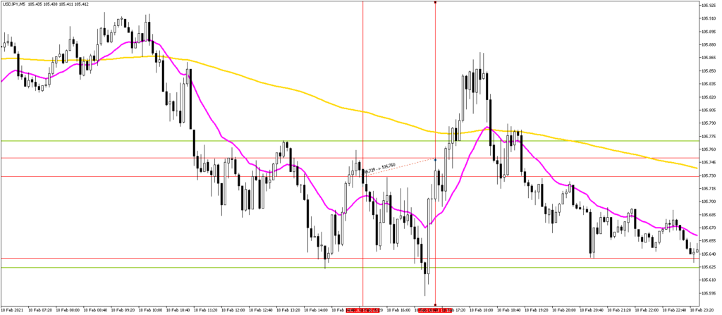 5分足で直近高値がレジスタンスになっていることを確認して売りエントリー。